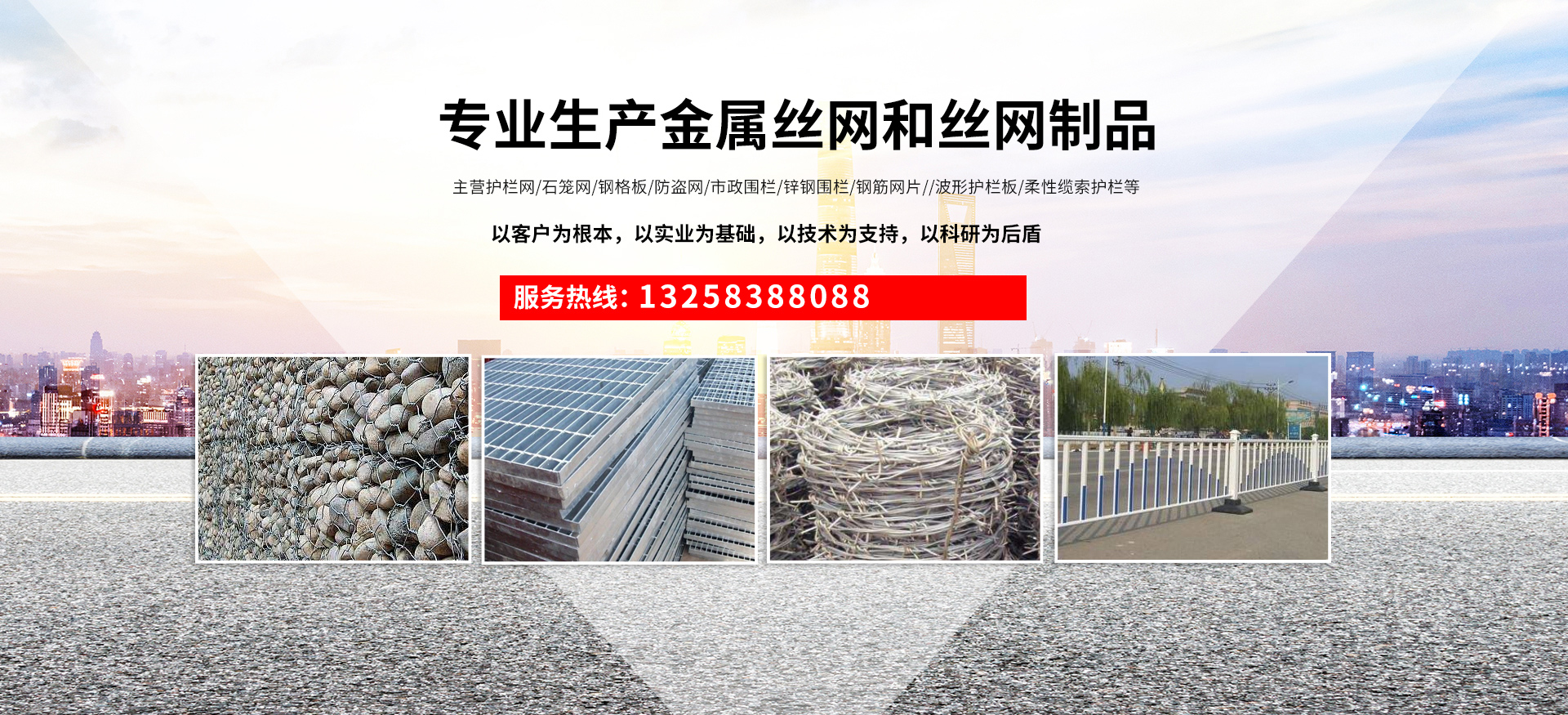 成都宏旭金屬絲網(wǎng)制造有限公司主營護(hù)欄網(wǎng)系列、石籠網(wǎng)系列、鋼格板、防盜網(wǎng)、市政圍欄、鋅鋼圍欄、鋼筋網(wǎng)片、聲屏障系列、波形護(hù)欄板、柔性纜索護(hù)欄、SNS邊坡防護(hù)網(wǎng)等其他絲網(wǎng)類產(chǎn)品。特殊規(guī)格可加工定做,也可根據(jù)客戶來圖來樣定做。自創(chuàng)業(yè)以來,公司一直堅(jiān)持市場為導(dǎo)向,以客戶為根本,以實(shí)業(yè)為基礎(chǔ),以技術(shù)為支持,以科研為后盾,集科研、生產(chǎn)、經(jīng)營為一體,不斷研制開發(fā)新產(chǎn)品,開拓市場,走綜合發(fā)展之路。多年來,公司憑借過硬的質(zhì)量,良好的信譽(yù)、優(yōu)質(zhì)的服務(wù)、合理的價(jià)格,贏得了市場和商家的一致好評。